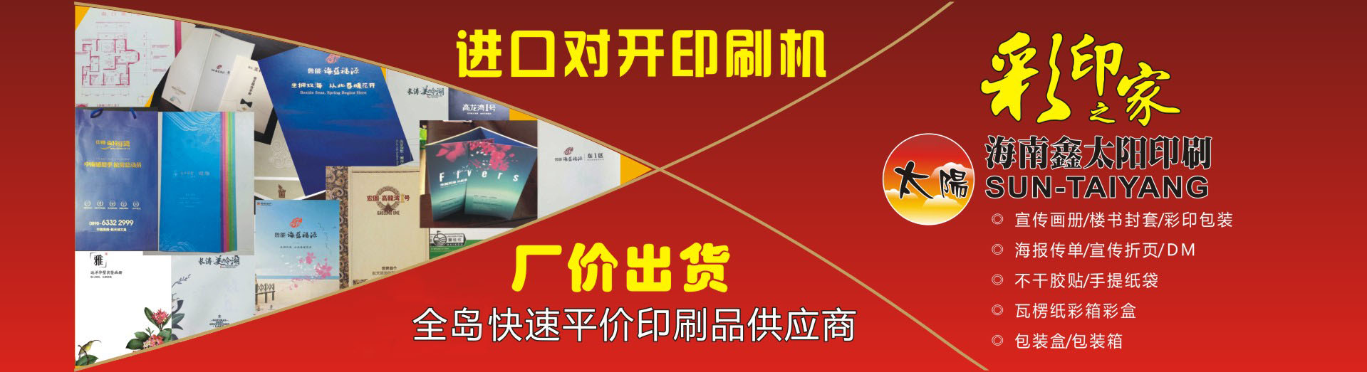 海南鑫太陽(yáng)印刷業(yè)有限公司成立于2002年,主要從事生產(chǎn)海報(bào)畫冊(cè)、傳單簡(jiǎn)介、精品包裝、掛歷臺(tái)歷、不干膠貼、手提紙袋、瓦楞紙包裝箱和彩箱紙盒等,公司有日本、德國(guó)等對(duì)開(kāi)及四開(kāi)高速彩色印刷機(jī)、自動(dòng)膠裝機(jī)、自動(dòng)鎖線機(jī)、自動(dòng)復(fù)膜機(jī)等先進(jìn)的自動(dòng)化設(shè)備,業(yè)務(wù)涉及商業(yè)、地產(chǎn)、水產(chǎn)、食品、農(nóng)林、藥品、化工、航空等行業(yè)的彩印包裝及宣傳印刷品。我公司另外還設(shè)有紙箱包裝廠,可以更好地為客戶配套生產(chǎn)各種檔次級(jí)別的瓦楞紙箱彩盒、普通紙箱紙盒、精裝禮盒等大型產(chǎn)品包裝,產(chǎn)品范圍包括花炮箱、飲料箱、食品箱、魚箱、花箱等。